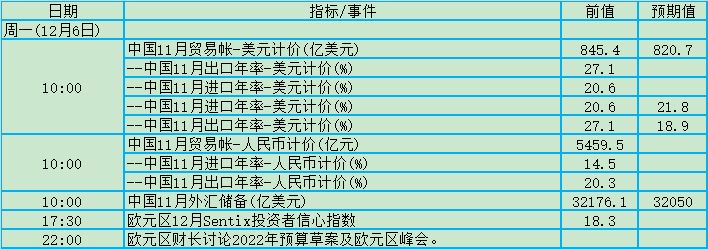周一(12月6日)关键词:中国外储、中国进出口、欧元区投资者信心