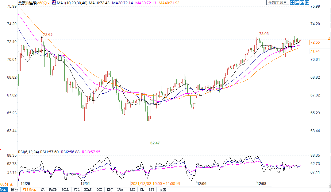 周三(12月8日)布油尾盘上涨0.69%,报收75.96美元/桶。自12月1日以来,全球指标布伦特原油已反弹约10%,收复了近三分之二因新变种导致的跌幅。市场向好基调未变,投资者不再认为Omicron变种会破坏全球经济增长,油价持续回升。