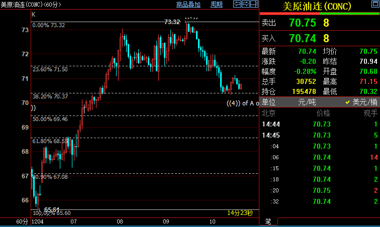 北京时间14:46,NYMEX原油期货下跌0.25%至70.76美元/桶;ICE布伦特原油期货下跌0.32%至74.18美元/桶。