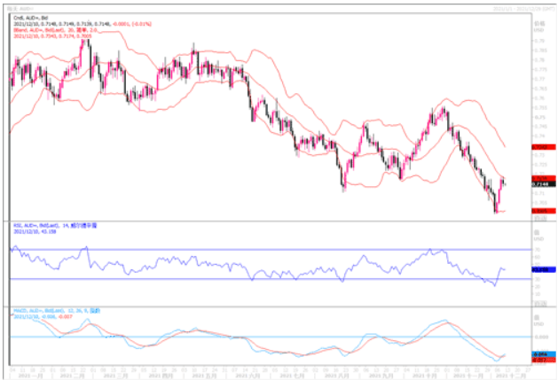澳元/美元延续涨至愈一周以来的最高水平 0.7186,但收盘时小幅下跌,处在 0.7150 附近。市场情绪恶化,澳元/美元出现下跌,美元获利最多。然而,市场波动有限,原因是大多数主要货币对都维持震荡。投资者等待下周公布新冠病毒变异毒株奥密克戎和美联储货币政策决议明朗化。澳元/美元维持在周三震荡区间上沿,而日图表明汇价上涨至看跌20移动均线后出现卖盘遇阻。动能指标维持朝下,处在负区,同时相对强弱指标已经失去动能,汇价下跌,处在负区。但由于汇价已经走出更高的高位和更高的低位,汇价能否延续下跌仍不明确。短线 4 小时图显示,汇价已经整理超买状况,但仍处在正区。澳元/美元仍处在看涨的20均线上方,而技术指标持平于正区。同时,汇价返回至看跌的100均线下方。若汇价跌破0.7140,则最近这轮反弹恐要告一段路。但大趋向还是要等下周美联储议息会议出结果后,方能明朗。在此之前,压住应注意回避押注澳元多头的风险。