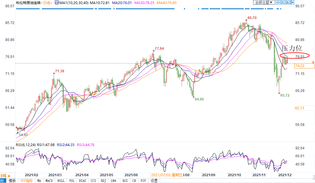 周一(12月13日)布油尾盘下跌0.93美元,跌幅为1.24%,报收74.22美元/桶。因人们对疫情是否对Omicron变种有效产生了新的怀疑,投资人担心世界各地不断增加的新冠病例可能会减少原油需求,令油价承压。