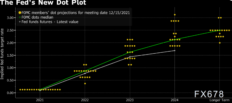 美联储FOMC 12月点阵图显示,所有委员均预计美联储将在2022年开始加息,具体为2022年和2023年分别加息三次。