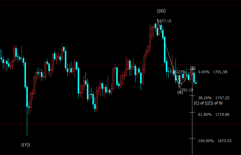 日线图上看,金价自1792美元开启下行(C)浪走势,后市料下探38.2%目标位1747美元。(C)浪是自1877美元开启的下行((Z))浪的子浪,((Z))浪则隶属于自2075美元开启的调整IV浪。