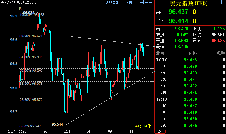 4小时图形上看,美元指数本周上破收敛楔形上沿,但并未站稳上方,96.60附近存在明显阻力。目前美指回测11月25日高点-12月1日低点构筑的区间61.8%斐波那契回档位96.40,若证实支撑有效,后市料重新上扬;反之则可能进一步下探上述区间50斐波那契回档位96.24。