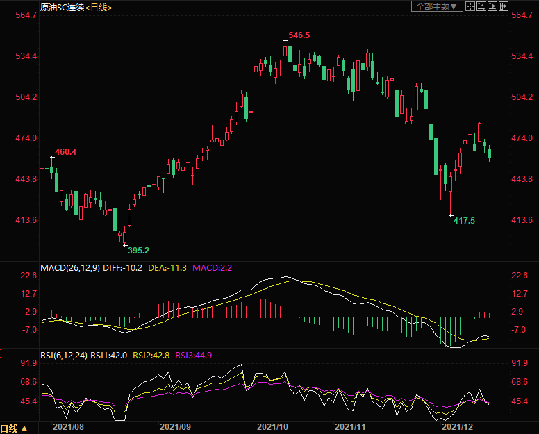 周三(12月15日)上海原油价格下跌2.00%,创一周多新低,主力合约2202终盘收于460.0元/桶,跌9.4元/桶,市场对明年供应增长将超过需求增长的预期越来越强烈,尽管人们认为Omicron新冠病毒变种不会像之前的变种那样严重阻碍出行。