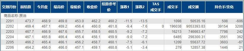上海原油价格下跌2.00%,创一周多新低,主力合约2202终盘收于460.0元/桶,跌9.4元/桶。