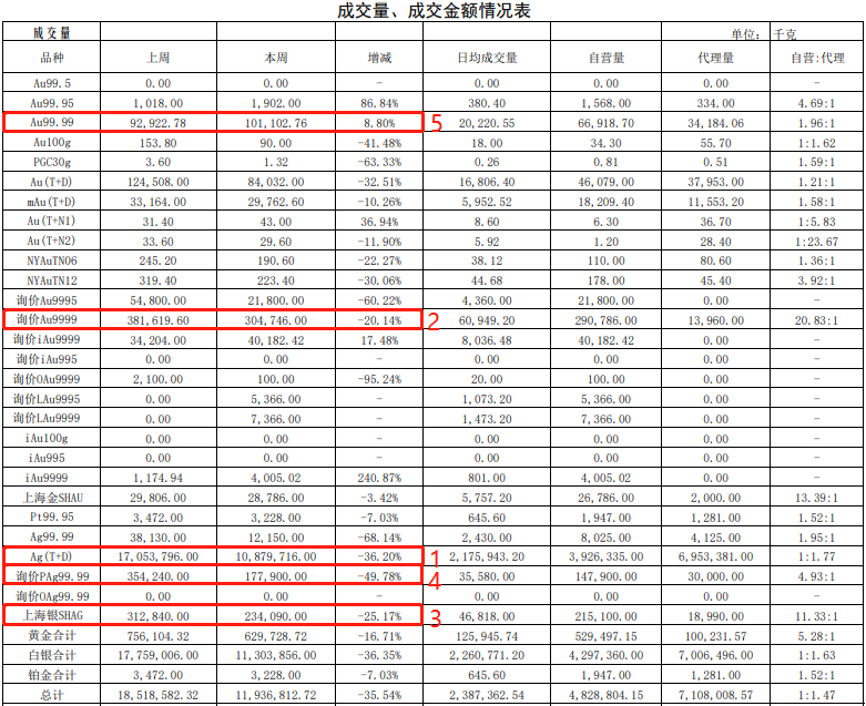 上海黄金交易所第47期行情周报:贵金属交易量小幅下跌