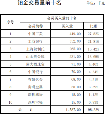 铂金交易方面,中国工美占据榜首位置,买入量达449千克,占比27.82%,工商银行第二,上海贺利氏第三。