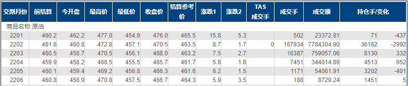 上海原油价格上涨1.88%,主力合约2202终盘收于470.5元/桶,涨8.7元/桶。