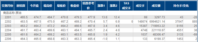 上海原油价格上涨1.23%,主力合约2202终盘收于469.2元/桶,涨5.7元/桶。