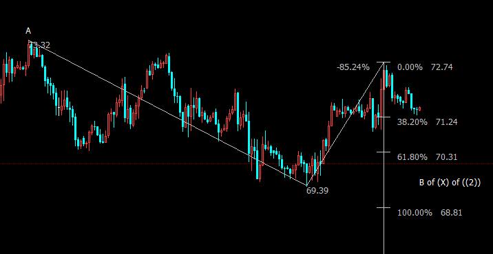 小时图上看,NYMEX原油自73.32美元开启的调整B浪出现延伸,料细分为((a))((b))((c))三子浪。近期下方支撑看向((c))浪61.8%目标位70.31美元。B浪是自62.47美元开启的反弹(X)浪的子浪。(X)浪则是自85.41美元开启的调整((2))浪的子浪。