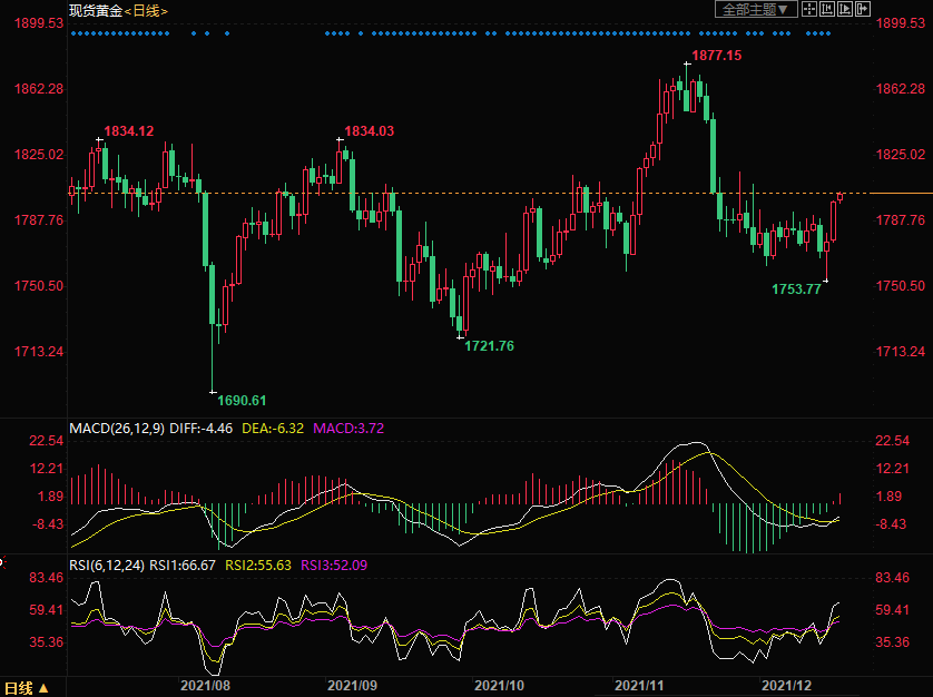 日线级别:金价周四大幅上涨,不过未能突破1800关口,周五早盘小幅上涨。