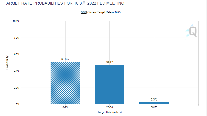货币市场显示,美联储2022年3月加息25基点的几率约为50%。上周末,又有多名美联储官员公开表示,最快有可能2022年3月加息,并在2022年中期开始缩减资产负债表。