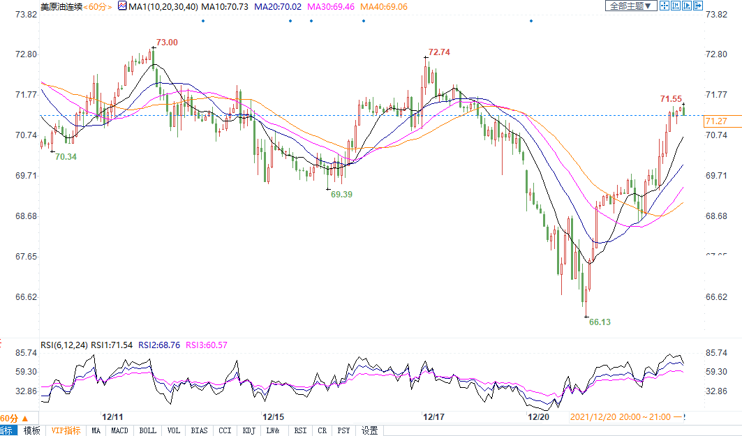 周二(12月21日)布油尾盘上涨2.47美元,涨幅为3.45%,报收73.99美元/桶。交易员在两天大跌后恢复买入风险资产,油价随美国股市上涨。同时英国首相约翰逊称不打算在圣诞节前实施新的防疫限制,使得油价短期利空因素有所削弱。不过投资者仍保持谨慎,因为Omicron变体削减了假日旅行计划,使近期燃料需求前景变得更加悲观。