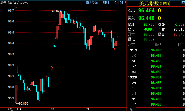 北京时间19:19,现货黄金上涨0.37%至1797.57美元/盎司;COMEX期金主力合约上涨0.18%至1797.8美元/盎司;美元指数下跌0.06%至96.451。