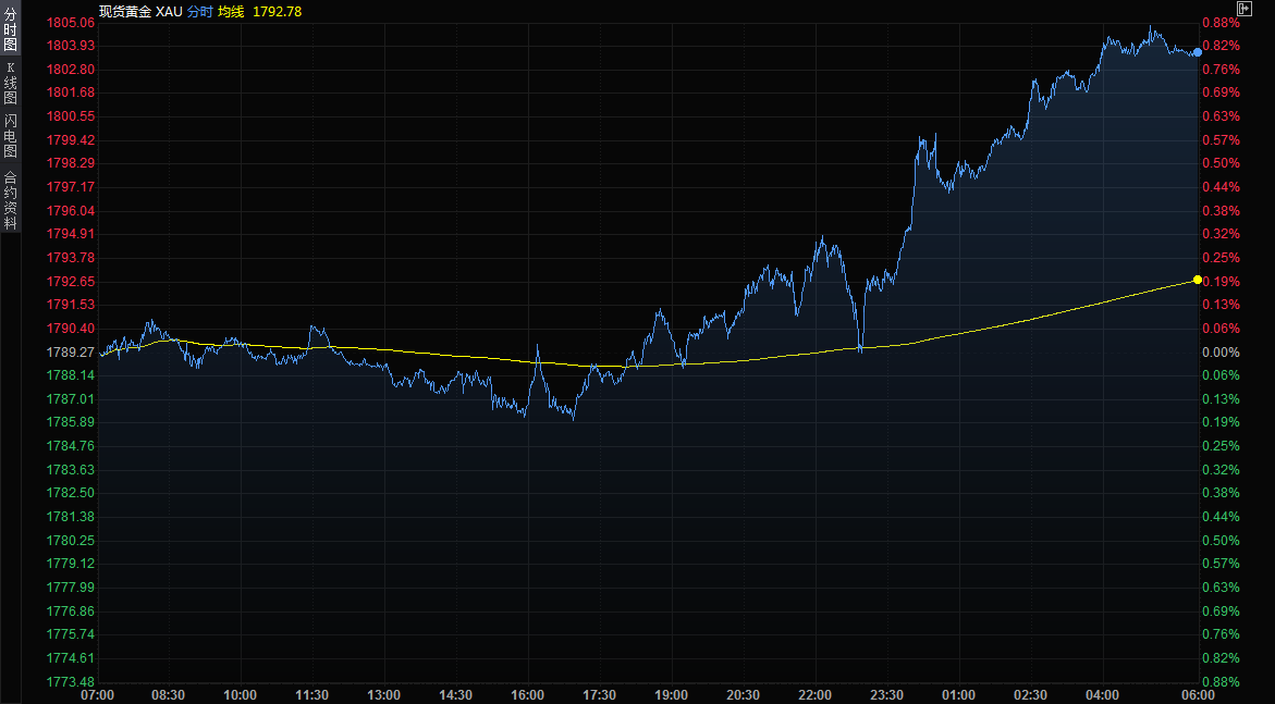 黄金价格周三上涨,现货黄金涨至1800关口上方,收报1803.67美元/盎司,得益于美元下跌,以及人们对奥密克戎冠状病毒变体可能阻碍全球经济复苏的担忧挥之不去。美国黄金期货收涨0.8%,报每盎司1802.20美元。