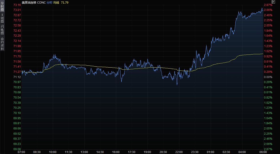 布伦特原油期货收盘上涨1.31美元,报每桶75.29美元,涨幅1.8%。美国原油期货结算价报每桶72.76美元,上涨1.64美元,涨幅2.3%。
