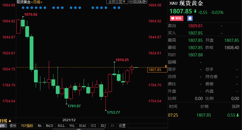 本周,现货黄金价格在流动性稀疏的情况下连续第二周走高,累计上涨逾0.5%,但未能突破上周创下的11月26日以来高点1814.25美元/盎司。市场对奥密克戎变种影响的担忧缓解,带动全球股市走高,限制了金价涨势。