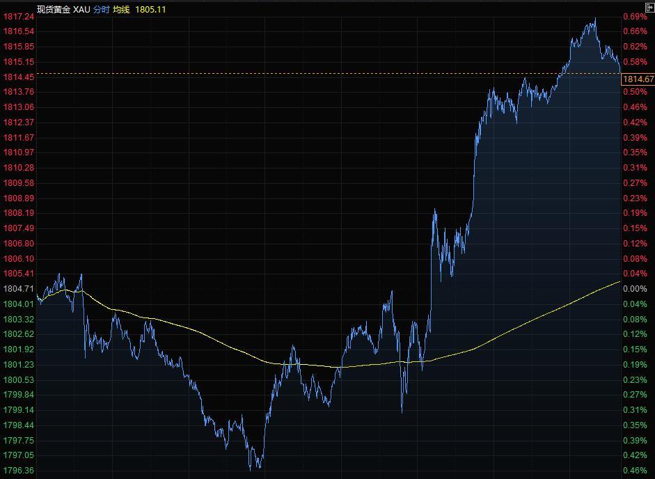现货黄金周四尾盘收报1814.67美元/盎司,为11月19日以来最高收盘价,美债收益率从一个月高位回落,美元涨幅缩窄支撑了金价。