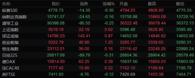 美股收盘情况:标普500指数下跌0.3%,报4778.73点;道琼斯工业平均指数下跌0.3%,报36398.08点;纳斯达克综合指数下跌0.2%,报15741.56点;纳斯达克100指数下跌0.4%,报16429.1点;罗素2000指数基本持平,报2248.793点。