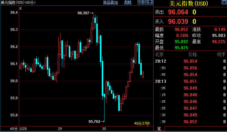 北京时间20:13,现货黄金下跌0.14%至1802.21美元/盎司;COMEX期金主力合约下跌0.18%至1802.6美元/盎司;美元指数上涨0.16%至96.048。