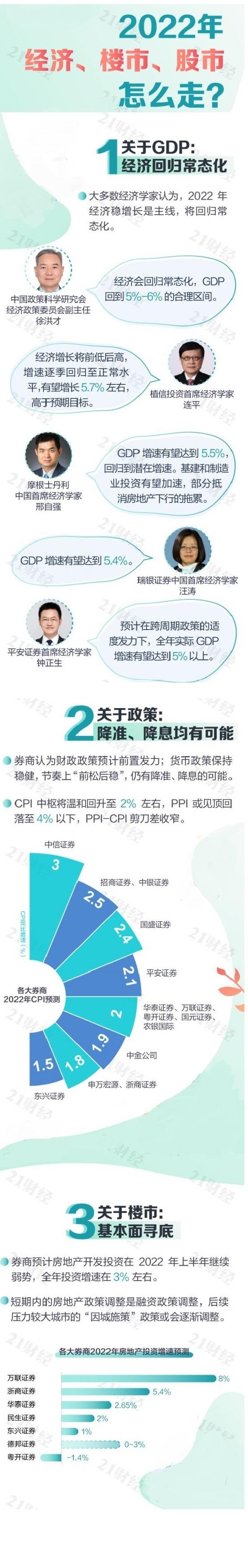 2022年,中国的经济、楼市、股市怎么走?大多数经济学家认为,2022年经济稳增长是主线,将回归常态化。券商认为,2022年降准、降息均有可能,预计房地产开发投资在上半年继续弱势。