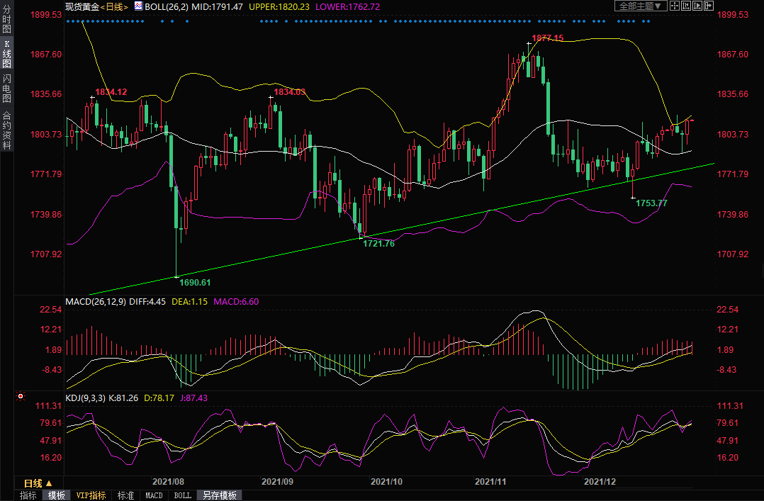 整体来看,虽然全球主要央行逐步收紧货币政策前景预期在中长线压制金价,但短期内欧美新冠疫情的恶化,仍给金价提供避险支撑,技术面看涨信号也有所增加,短线金价偏向震荡走高,有望试探7月份高点1834附近阻力,甚至是1850关口。