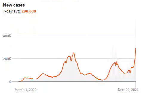 统计显示,美国单日新增病例七天均值超过29万例,连续第二天创下纪录新高。