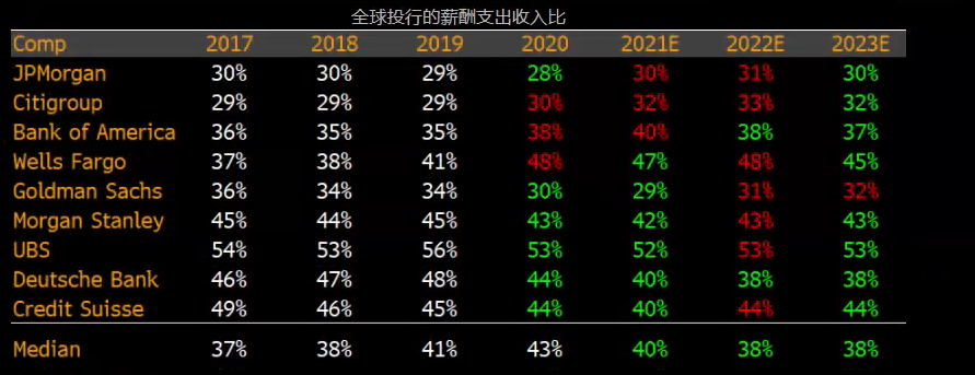 2022年各大投行薪酬支出收入比可能上升