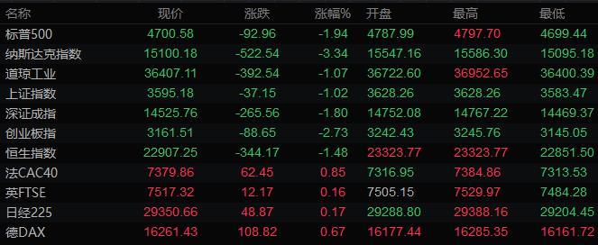 美股收盘情况:标普500指数下跌1.9%,报4700.58点;道琼斯工业平均指数下跌1.1%,报36407.11点;纳斯达克综合指数下跌3.3%,报15100.17点;纳斯达克100指数下跌3.1%,报15771.78点;罗素2000指数下跌3.3%,报2193.999点。