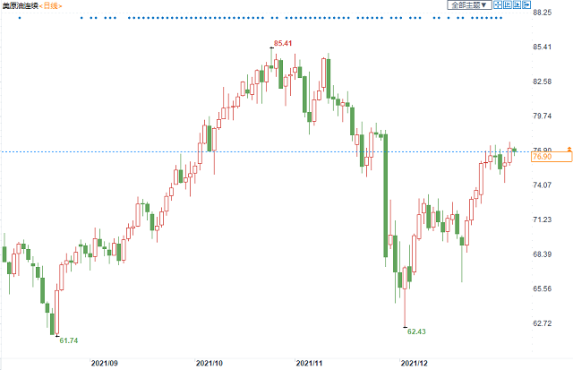 北京时间1月5日19:17,美原油期货价格报76.90美元/桶。