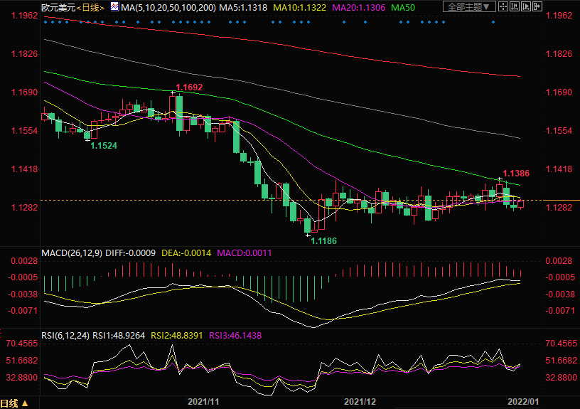 自11月底以来欧元兑美元一直交投于1.1180-1.1380的区间内。荷兰国际集团的经济学家预计该货币对将在2022年上半年跌破该区间。