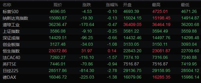 美股收盘情况:标普500指数下跌0.1%,报4696.05点;道琼斯工业平均指数下跌0.5%,报36236.47点;纳斯达克综合指数下跌0.1%,报15080.87点;纳斯达克100指数基本持平,报15765.36点;罗素2000指数上涨0.6%,报2206.372点。