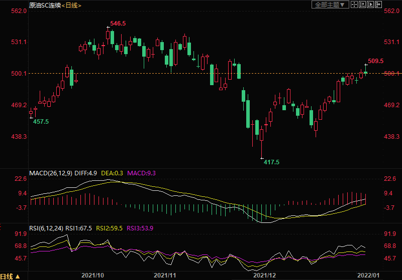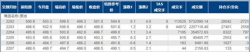 上海原油价格微涨0.02%,一度刷新逾五周新高,主力合约2202终盘收于501.0元/桶,涨0.1元/桶。