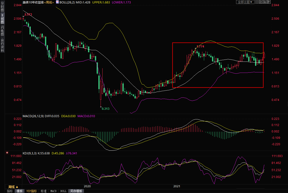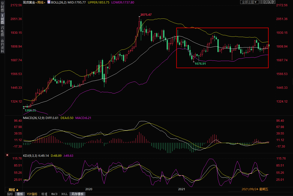从周线来看,金价暂时处于震荡走势,需关注布林线轨道1737.84-1853.21区域的突破情况,更大的区间参考1678-1965区域突破情况。