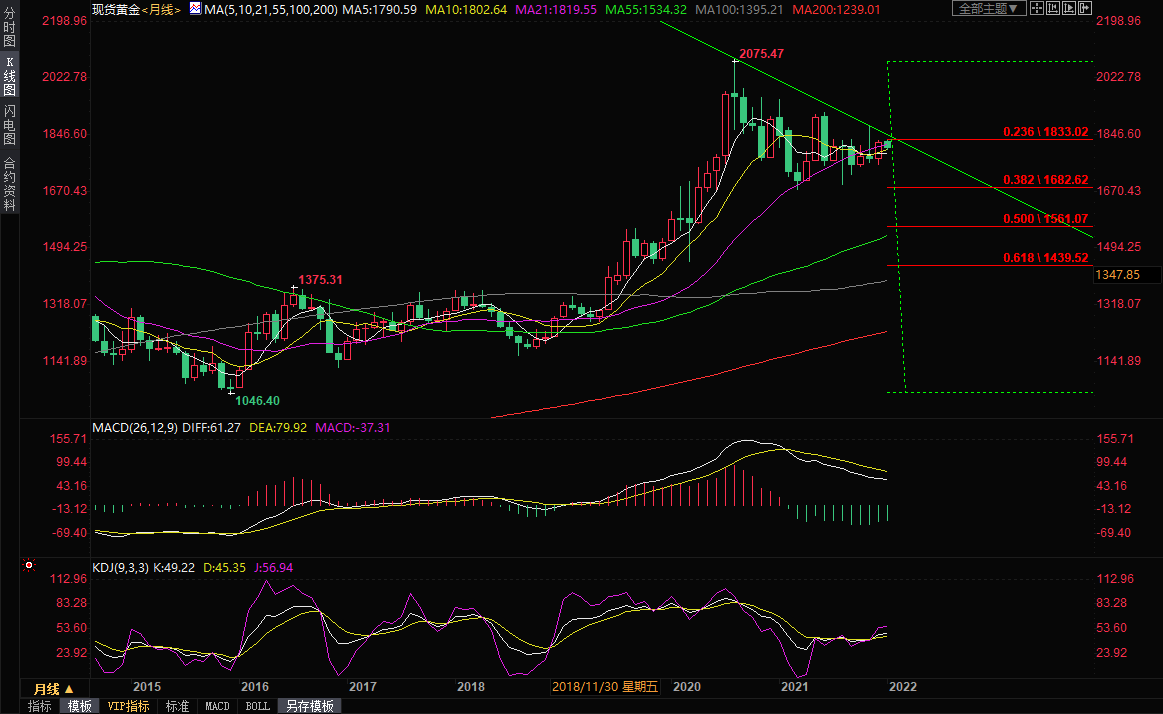 从月线来看,金价在2075附近见顶后展开了回调走势,目前均线交织,MACD死叉,KDJ金叉,后市走势变数较大,由于高点逐步回落,后市仍有进一步回调分风险,关注1046-2075涨势的38.2%回撤位1682.5附近支撑,如果失守该支撑,则增加后市看空信号。