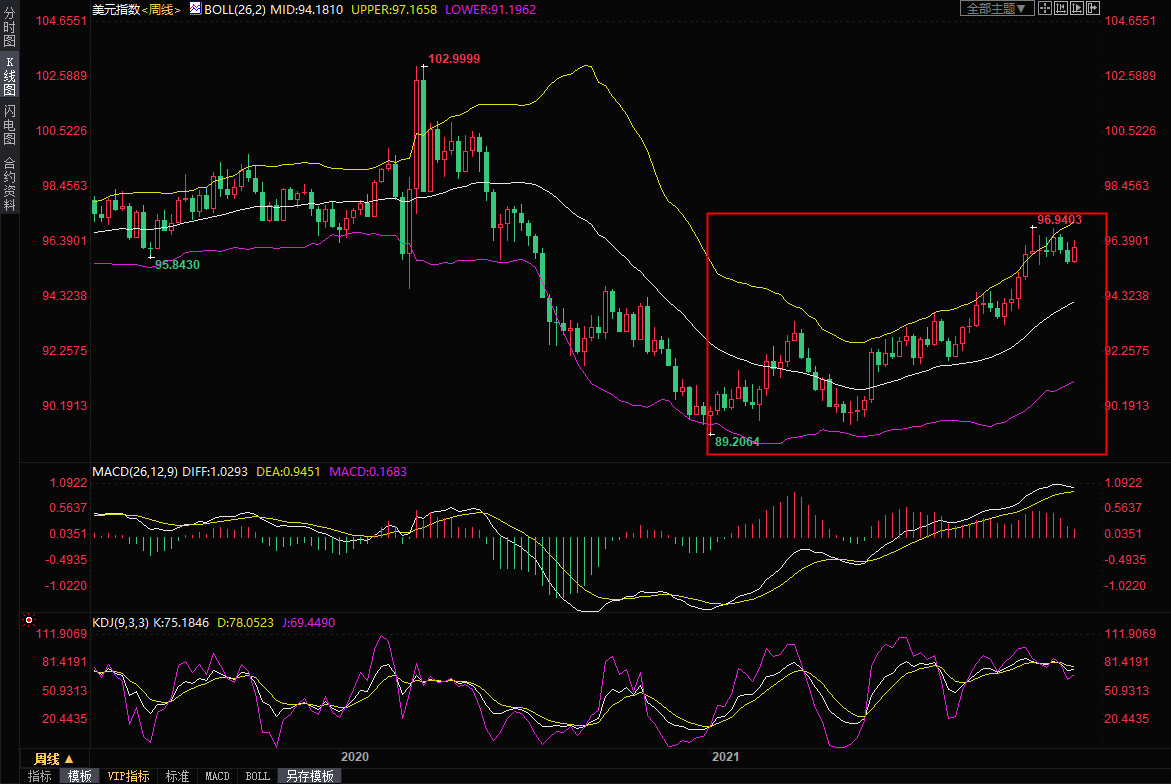 美元指数方面,2021年美元指数从90关口附近涨至96关口附近,收报95.67,全年累计上涨6.35%,为近六年最大年度涨幅。美国十年期国债收益率从1%下方,涨至1.51%,全年涨幅约65.39%。