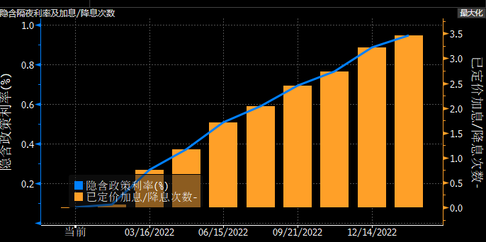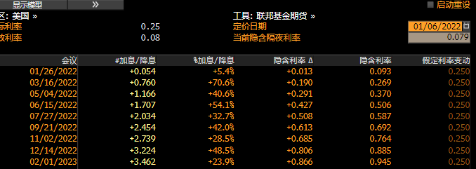 2022年1月6日利率期货显示,美联储将在2022年3月份加息的概率高达76%,2022年将加息三次的概率为100%,而2022年年底前加息四次的概率也有22%。