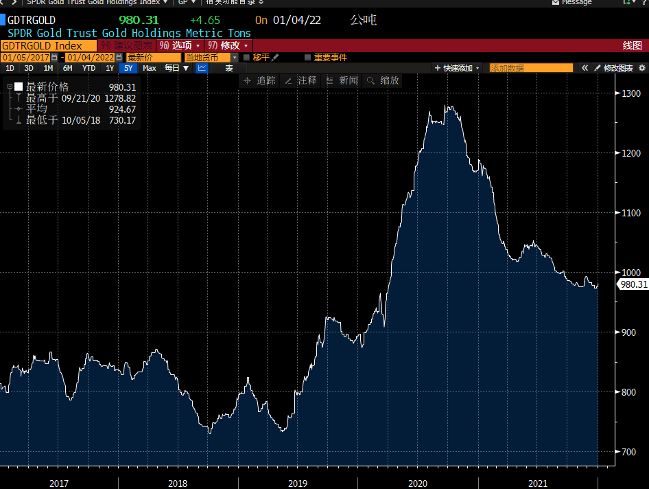 全球最大的黄金ETF SPDR Gold Shares的数据显示2021年出现了近10年来最大的年度外流,2021年规模减少了约141亿美元,相当于价值约195吨的黄金。根据GLD提供的数据,这是自2013年以来最大的年度资金外流。