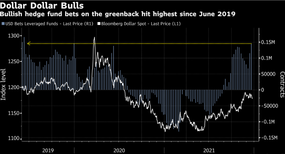 据美国银行的2021年12月份的一项调查,基金对美元的看涨程度为2015年以来最高。对冲基金对美元的净多头押注已攀升至2019年6月以来的最高水平,因围绕美国货币政策收紧影响的预期正在积聚。