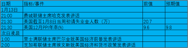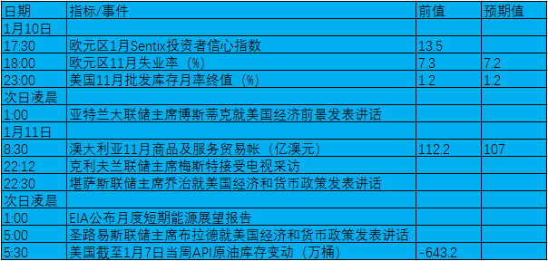 1月10日-16日当周,美国方面将公布一些重要的经济数据,其中包括美国12月CPI、PPI、EIA、初请、零售销售及消费者信心。其他国家需要关注的数据包括欧元区失业率、英国与德国GDP、中国CPI、PPI及贸易帐等。除此之外,美联储官员将密集露面讲话,这对市场行情有较大的影响力,投资者需要密切关注。