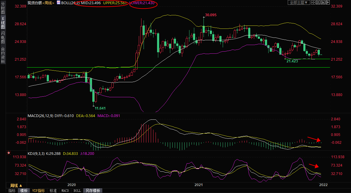 从周线图来看,银价在布林线中轨下方运行,MACD粘合,KDJ轻微向下发散,后市略微偏向下行,关注10月份低点21.42附近支撑,也是布林线下轨支撑所在,如果跌破该支撑,或将打开下跌通道。