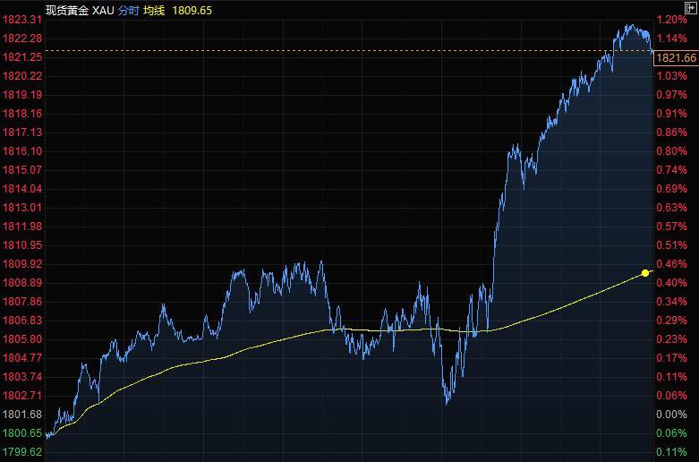 现货黄金周二涨逾1%,刷新1月5日以来高点至1823.31美元/盎司,美元下跌,此前美联储主席鲍威尔在国会作证时,并未在收紧货币政策方面做出任何意外评论,美债收益率回落也为提供支撑。