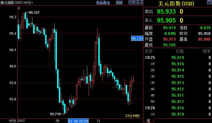 北京时间19:25,现货黄金上涨0.21%至1805.49美元/盎司;COMEX期金主力合约上涨0.34%至1804.9美元/盎司;美元指数下跌0.04%至95.917。
