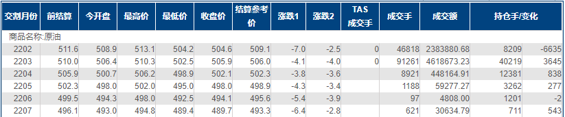 上海原油价格下跌0.8%,主力合约2203终盘收于505.9元/桶,跌4.1元/桶。