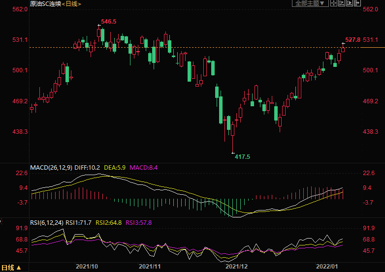 周四(1月13日)上海原油价格上涨1.83%,创两个月新高,主力合约2203终盘收于524.1元/桶,涨9.4元/桶,因供应吃紧,全球最大消费国美国的原油库存跌至2018年以来的最低水平,以及美元走软和对Omicron变种的担忧缓解。