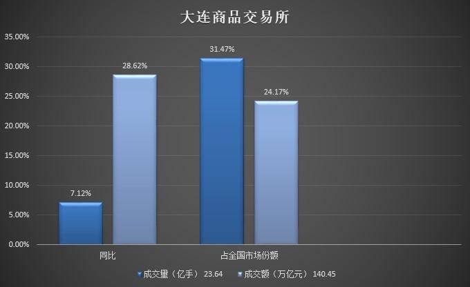 大连商品交易所2021年成交量为23.64亿手,成交额为140.45万亿元,同比分别增长7.12%和28.62%,分别占全国市场的31.47%和24.17%。