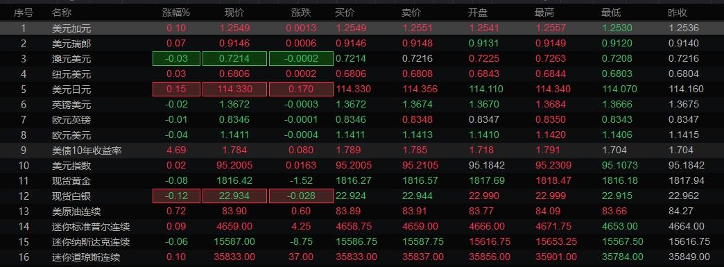 美元指数升0.32%,报95.18,但上周收低约0.6%,为9月初以来最糟单周表现;美国10年期国债收益率涨8个基点至1.784%。