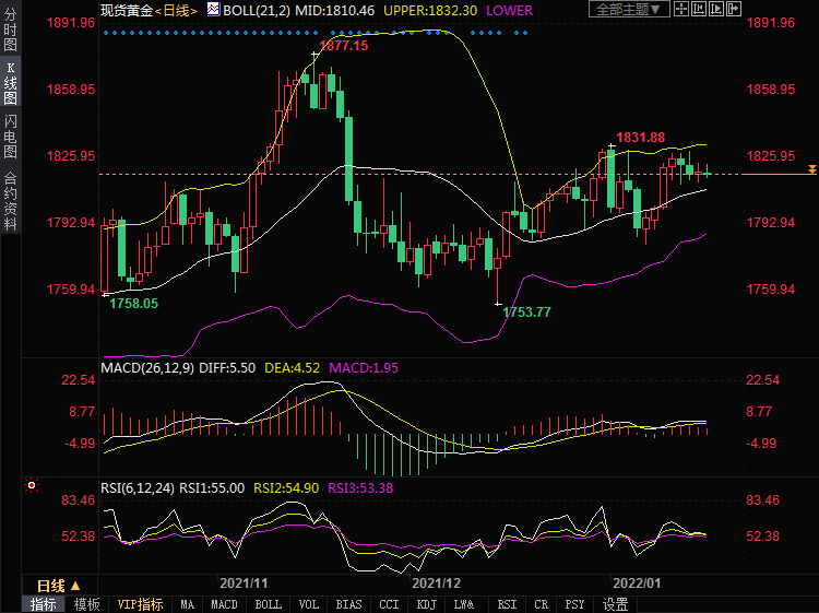 下方重要支撑在布林带中轨1810.46,跌破这一水平则意味着后市将跌向更低点,进一步支撑关注1800.00心理关口以及12月8日高位1793.15。