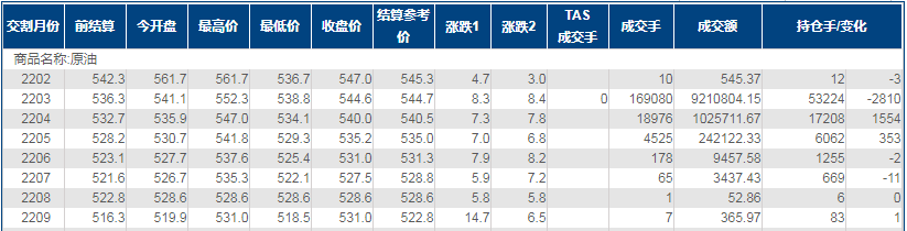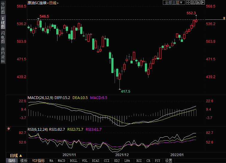 上海原油价格上涨1.55%,一度触及三年多新高,主力合约2203终盘收于544.6元/桶,涨8.3元/桶。